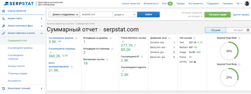 Так как площадка имеет большое количество инструментов для анализа и сбора информации по сайтам, рассмотрим самые главные из них.