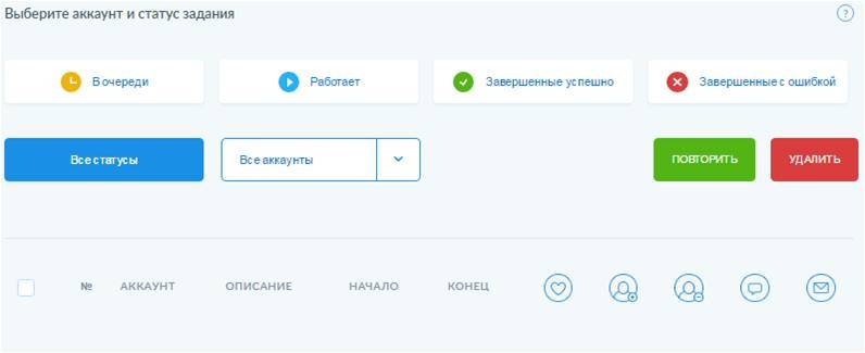Во вкладке «История заданий» можно проследить действия, выполняемые сервисом. Здесь будет предоставлен подробный отчет всего, что сделал InstaPlus.me: сколько лайков поставил, на сколько аккаунтов подписался, начало и конец работы и т.д. Можно фильтровать список по статусу заданий и по аккаунтам.