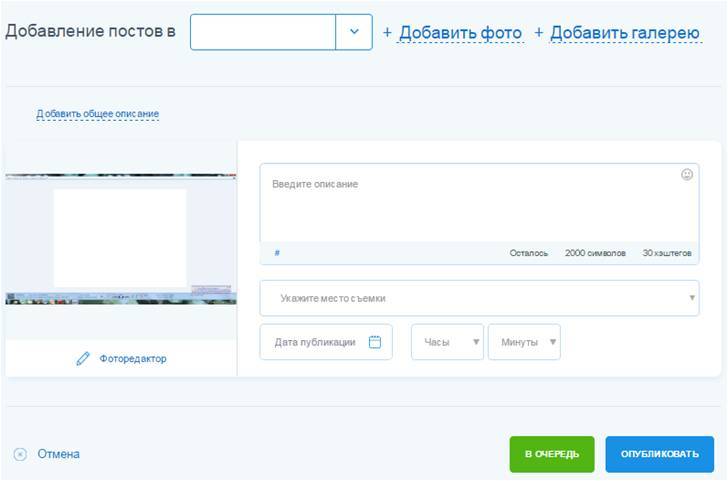 Еще одна очень полезная функцией является «Автопостинг». Здесь вы можете не только просматривать свою ленту, но и заранее подготовить посты, которые будут выкладываться в установленное вами время. В наличии и фоторедактор.
