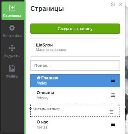- «Страницы». Здесь можно создавать, удалять страницы и менять их порядок следования. При создании страницы можно автоматически перенести части макета «Главной страницы», а хедер и футер копируются по умолчанию. Это позволяет не выполнять одни и те же действия несколько раз.