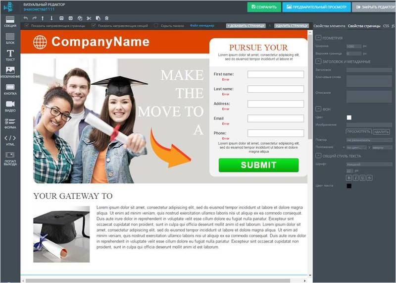 Если вы выбираете создание лендинга из существующих шаблонов, то исходя из заданной вертикали, вам предоставят тематические шаблоны. Их можно просмотреть перед выбором в полномасштабном режиме. После того, как определитесь с выбором, вы попадете в редактор. Он очень прост для понимания и в использовании.