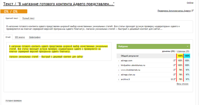 - Неоригинальные фразы высвечиваются синим цветом. Это значит, что указанный текст рерайтился.