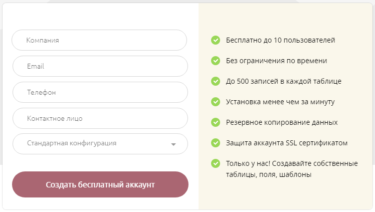 При создании аккаунта пользователю нужно указать название копании, e-mail, номер телефона, контактное лицо и выбрать конфигурацию (автошкола, салон красоты, стоматология и прочее), что позволит автоматически подстроить под вид вашей деятельности структуру программы.
