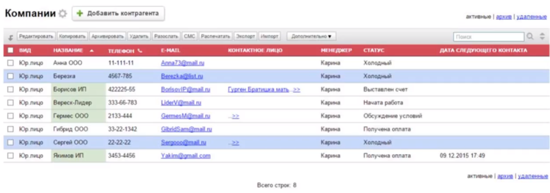 Данный сервис позволяет всю информацию компании объединить в единую базу. Все клиенты компании, их сотрудники и история переговоров с ними хранится в одном месте. Что это дает? За каждым менеджером можно закреплять своих клиентов, также можно настроить доступ к данным вплоть до каждого поля (редактирование/просмотр записей). А настроив систему оповещений, менеджеры всегда будут знать, когда стоит позвонить клиенту и т.п.