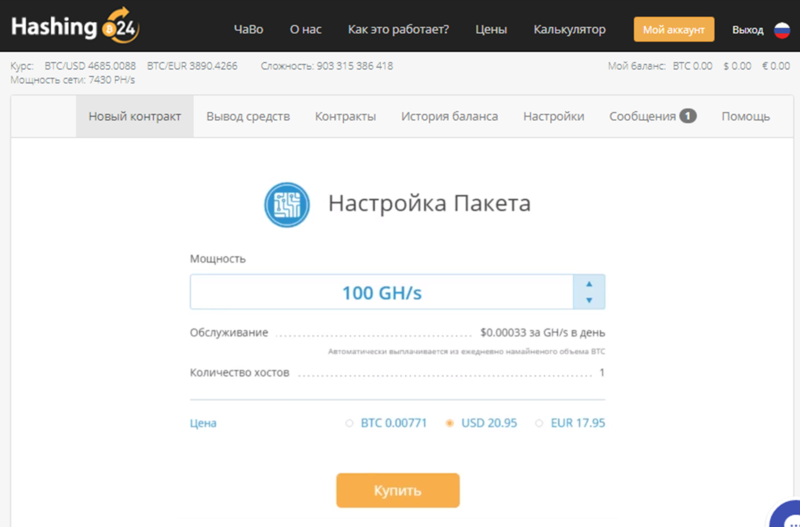 На сегодняшний день минимальный контракт в размере 100 GH/s будет стоить $31,95 или 0.007196 BTC. А плата за обслуживание составляет $0,00033 за GH/s в день. Выплата за обслуживание автоматически осуществляется из ежедневно намайненного объема BTC, в соответствии курса биткойна к доллару на этот день.