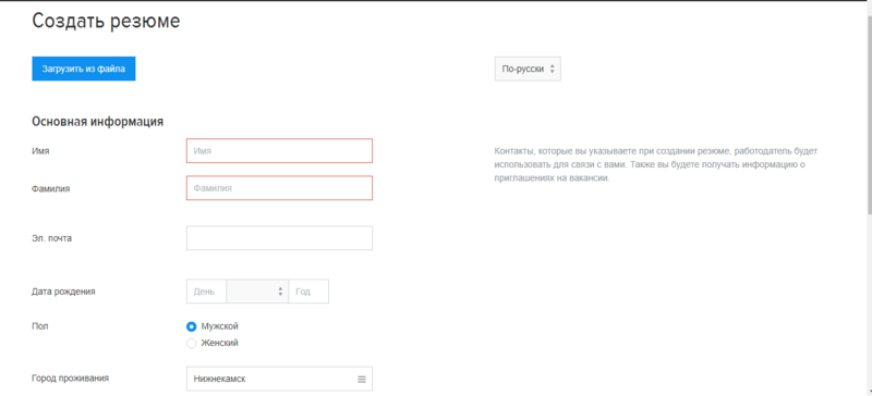 Далее потребуется создать своё резюме или загрузить готовое, если оно у вас есть. При создании вам нужно будет заполнить основную информацию: ФИО, дату рождения, образование, опыт работы, город проживания и т.п. И как можно подробнее расписываем свои качества и профессиональные навыки для привлечения внимания работодателей.
