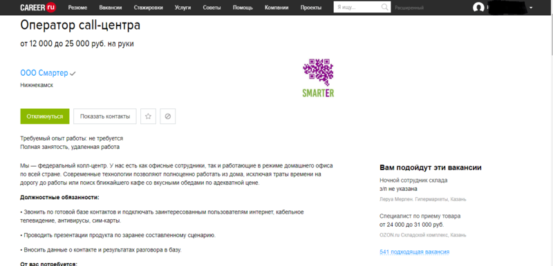Если нашли подходящее объявление, переходим по ней и вам откроется полное описание вакансии. Здесь будут представлены условия работы, график, обязанности и подробное описание работы, которую нужно будет выполнять. Если все условия вас устраивают нажимаем на кнопку “откликнуться”.