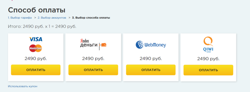 Разработчики не ограничивают вас в количестве добавляемых аккаунтов, вы можете добавить одновременно раскручивать множество профилей. Справой стороны страницы расписаны все доступные тарифы, чтобы перейти к оплате нужно перейти по интересующему вас плану. Дальше нужно будет выбрать удобный для вас способ оплаты: visa, яндекс деньги, webmoney или qiwi.