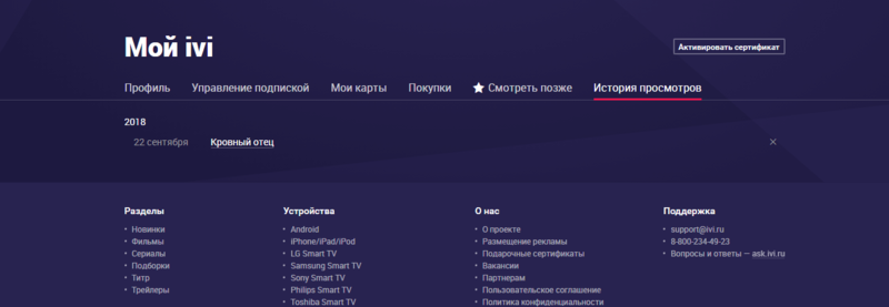 В своем личном кабинете вы можете найти историю просмотров, и при переходе, на видеоматериал, который вы не досмотрели, воспроизведение начнется с того момента где вы остановились. Здесь же доступны покупки, фильмы, которые собираетесь посмотреть позже и управление подпиской сервиса.