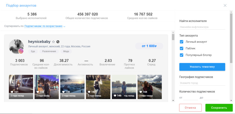 Можно указать тип аккаунта, репозицию, количество необходимых подписчиков, возраст и пол самого инфлюдера. Эти данные помогут вам выбрать наиболее качественного исполнителя, чтобы ваша реклама была как можно более эффективной.