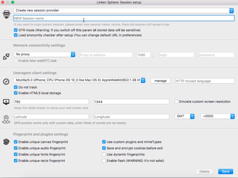 Каждая сессия имеет персональные настройки юзерагента, времени, системного языка, разрешения экрана и настройки геопозиции.