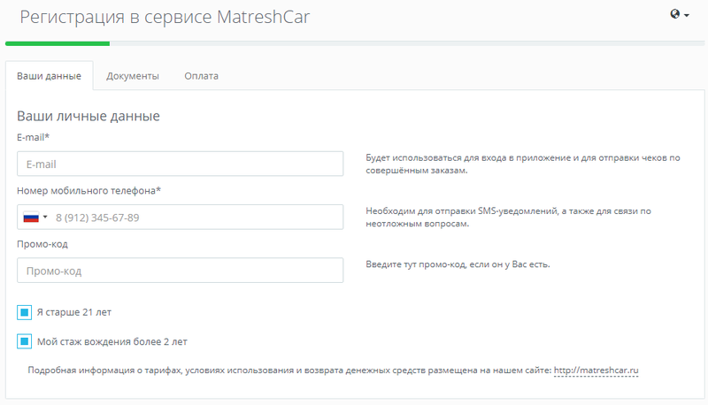 Прежде чем приступить к использованию услуг и ресурсов сервиса, пользователь должен пройти достаточно стандартный процесс регистрации, с предоставлением личного фото, паспортных данных, водительских прав соответствующей категории, привязкой банковской карточки и дальнейшим подтверждением пакета данных представителями сервиса. Регистрироваться можно как через компьютер, на основном онлайн портале компании, так и через мобильное приложение.