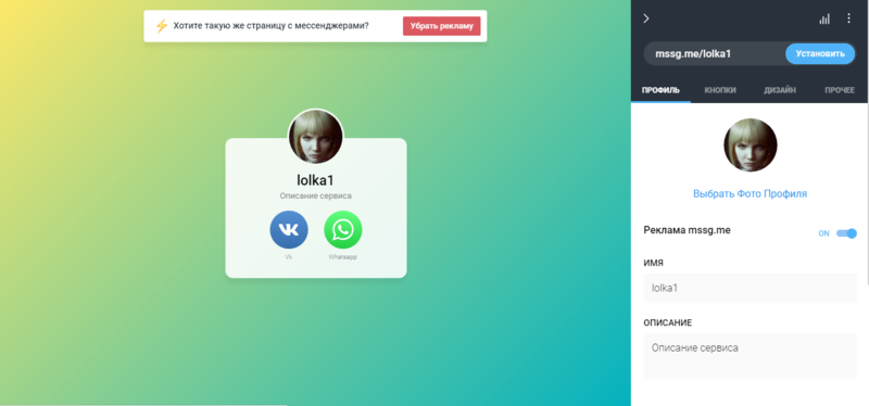 Чтобы воспользоваться услугами mssg.me, нужно зарегистрироваться на сайте сервиса. Дальше вам понадобится описать ваш профиль, придумать адрес вида URL и привязать к нему все свои мессенджеры или страницы в социальных сетях. Созданная страница будет являться вашей персональной визиткой, которая хорошо отображается не только в декстопных версиях браузера, а также отлично оптимизирована под мобильные устройства.