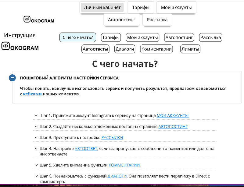 Платформа «Okogram» предназначена для увеличения популярности профилей в социальной сети «Инстаграм». Сервис производит рассылку сообщений в «Директы», а также отлавливает лиды возможных конкурентов. Платформа достаточно юная, функционирует всего на протяжении двух лет, однако уже успела обрести высокую популярность. Для новых пользователей, сайт предлагает бесплатную, пробную демо-подписку, за время которой, пользователь имеет возможность протестировать ресурс и все его возможности. Также на сайте имеется интерактивный онлайн чат, в котором всегда имеется консультант готовый в любой момент оказать помощь клиентам.