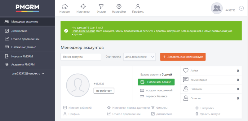 Далее вы попадаете в менеджер аккаунтов, где вам нужно добавить профиль intagram, который вы собираетесь продвигать. Также не забываем пополнить баланс, без этого сервис не будет работать.