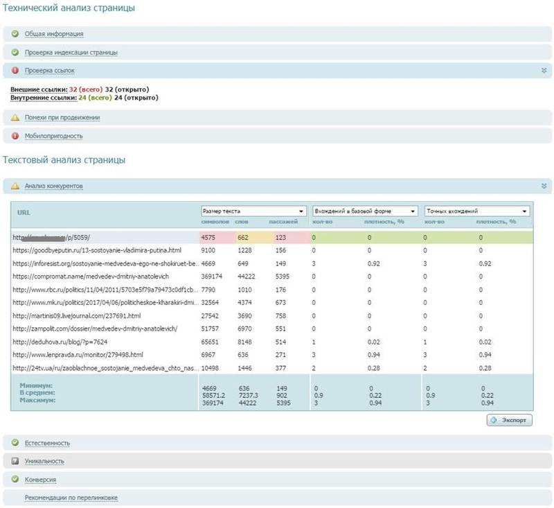 В данном случае, например, система рекомендует снизить количество внешних ссылок, и анализ конкурентов выявляет недостаточное количество символов и пассажей.