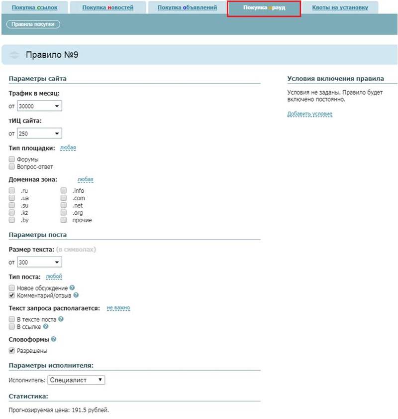 Для того чтобы приобрести вечные ссылки, в таблице запросов в столбце «Бюджет» определить для них стоимость, или разрешить системе самой определить эту стоимость.
