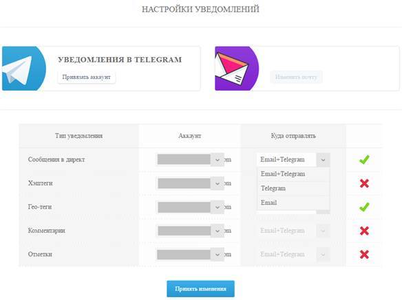 - Есть возможность настроить рассылку оповещений нужной вам информации, например, комментарии под фото, сообщения в директ и т.д., на вашу почту или Telegram.
