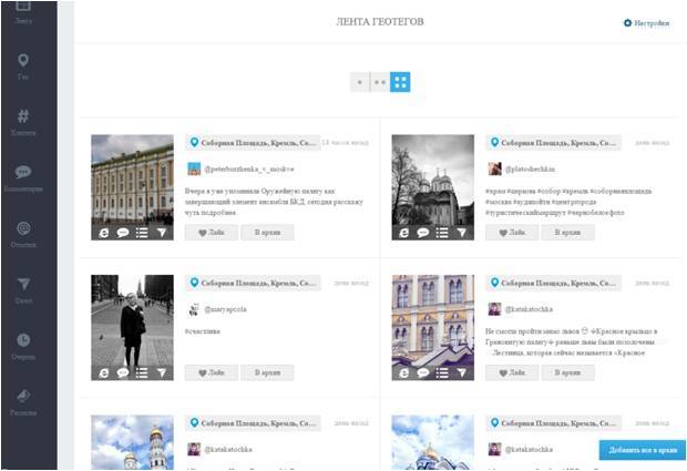 - Во вкладке «Гео» для начала в настройках нужно добавить все интересующие вас гео-точки. После этого в ленте геотегов будут присутствовать все новые записи, которые опубликованы по определенным вами геолокациям.