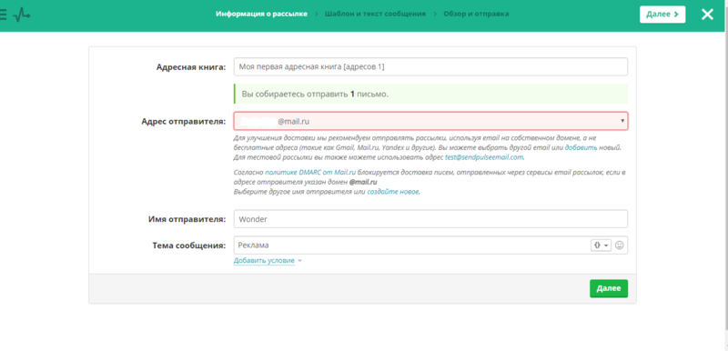 В первом окне, необходимо ввести информацию о рассылке: тему сообщения, имя отправителя и т.п.