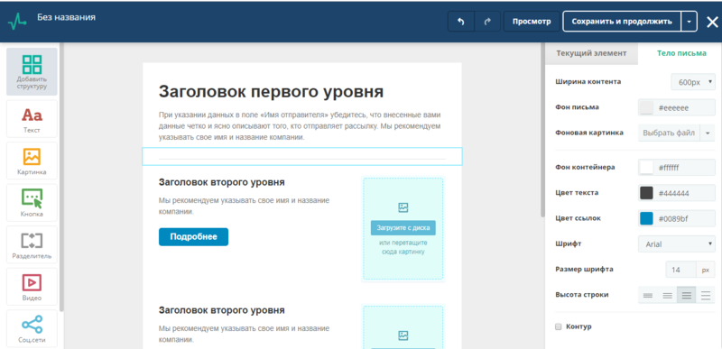 В самом конструкторе вам просто нужно будет выбрать близкий по тематике шаблон и заполнить все необходимые заголовки и текст сообщения. Необходимые блоки можно добавить с панели инструментов.
