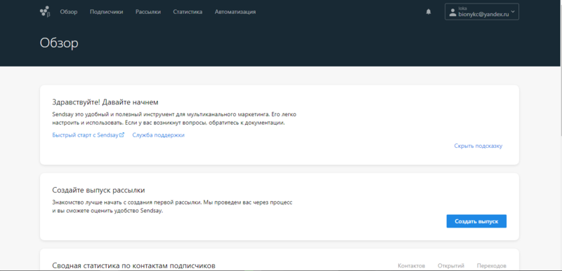 Первым делом регистрируемся на сайте платформы и заходим на главную страницу. Здесь вы сможете пройти обучающий курс и увидеть статистику по подписчикам. Нам потребуется добавить подписчиков, поэтому в верхнем меню переходим по вкладке “Подписчики”