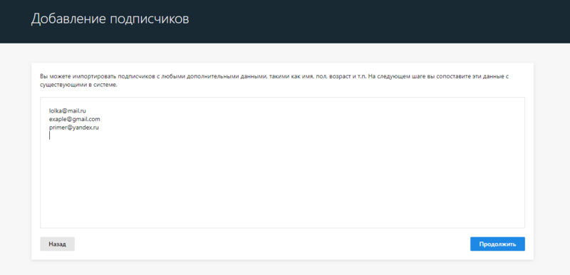 И в новом окне нажимаем на большой плюсик, где откроется текстовое окно, в которое нужно будет ввести почтовые адреса клиентов или перетащить файл с готовой базой данных. Если подписчиков нет, можно воспользоваться формой сбора на своем сайте. Акцентируем ваше внимание, что можно добавлять только пользователей, которые дали на это согласие, покупные базы использовать запрещено.