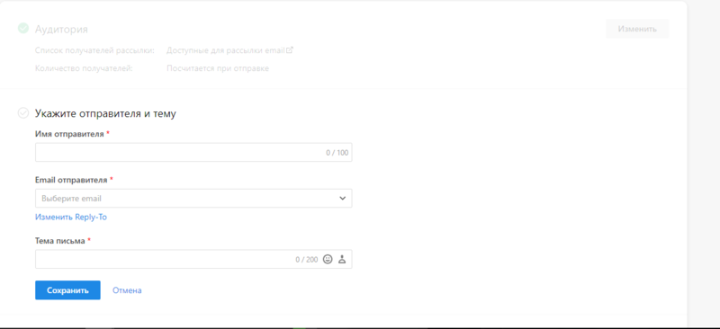 Чтобы начать саму рассылку переходим по вкладке “Рассылки”, также нажимаем на плюсик и создаем форму письма. Здесь выбираем нужный сегмент аудитории и имя/адрес отправителя.