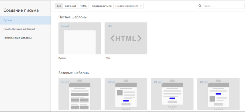 И теперь создаем само письмо, вы можете использовать встроенный редактор, который имеет каталог готовых шаблонов. Или же можно отправить простой текст.