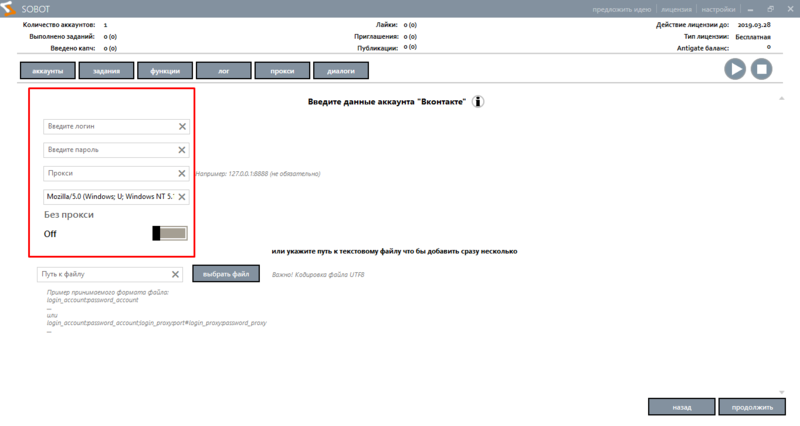 В главном окне программы нужно будет добавить аккаунты, с которыми будет вестись работа. Для этого нажимаем на «добавить аккаунт», выбираем тип социальной сети и вводим логин и пароль, или указываем путь к текстовому файлу с готовым списком аккаунтов. Также здесь подключаем свой прокси сервер и нажимаем кнопку «продолжить».