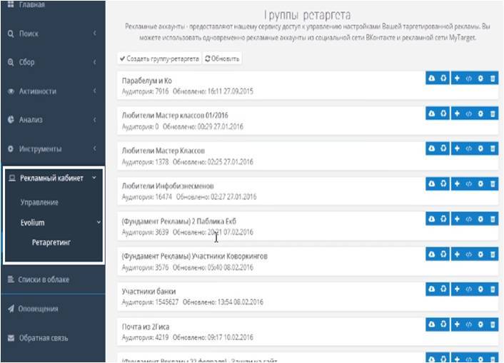 Здесь же можно создавать базы ретаргетинга и применять к ним разный функционал.