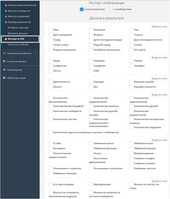 Дает возможность списки с пользователями и сообществами экспортировать в файлы формата CVS.