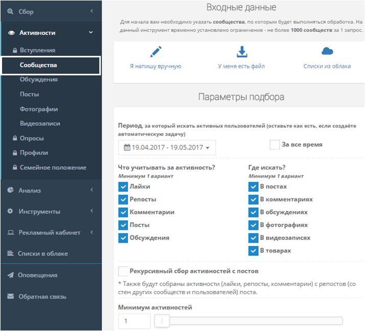 Эта функция поможет найти новых вступивших пользователей в указанные вами сообщества. Таким образом вы сможете отследить новых вступивших в вашу группу людей и сделать им выгодное предложение, или отследить новых потенциальных клиентов ваших конкурентов. - «Сообщества»
