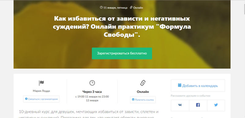 Каждый ивент имеет краткое описание и счетчик пользователей, которые решили посетить данное мероприятие. После перехода на страницу, например, на этот тренинг, откроется страница с подробным описанием, датой встречи. Здесь вы можете добавить событие в Google календарь, а в конце страницы пройти регистрацию и купить билет на мероприятие.