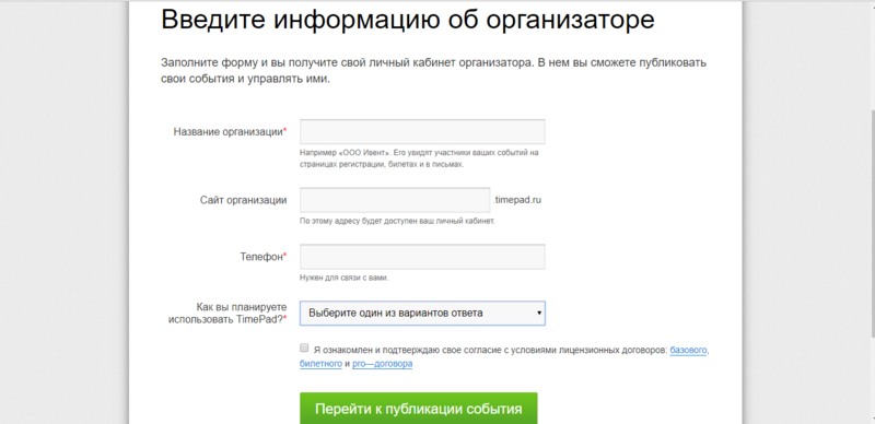 Теперь начинаем создавать свое мероприятие, для этого переходим по вкладке “Создать событие”. В новом окне необходимо будет ввести информацию об вашей организации, чтобы получить свой личный кабинет, откуда вы сможете создавать новые события и управлять ими. Заполняем название организации, сайт и телефонный номер.