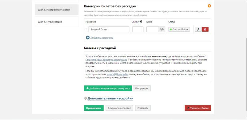 - Если ваше событие платное, то вы можете установить цену билетов и их количество. Важно знать, что для этого вам придётся заключить договор с TimePad.