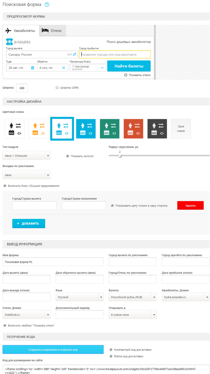 Предусмотрен форма-конструктор, который позволяет создать формы поиска под дизайн вашего сайта. Самостоятельно можно определить ширину формы, цветовую схему, радиус округления, тип модуля (только авиа, только отели, авиа + отели), и можно корректировать выводимую информацию (язык, валюта, значения полей по умолчанию и прочее). После сохранения всех внесенных изменений сервис предоставляет код получившейся в итоге формы.