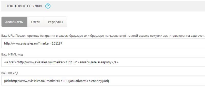 После вам предоставляются коды виджета поиска/календаря/тизера, множества баннеров, ссылок на скачивание приложений и код для генерации ссылок, которые вы сможете разместить на своем сайте.