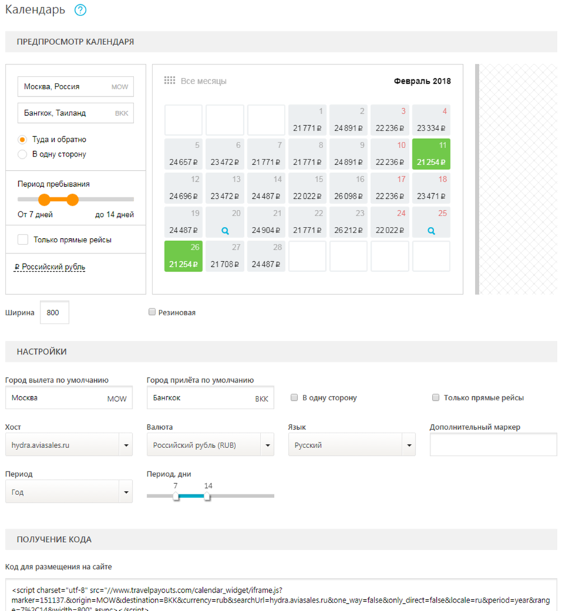 Можно настроить ширину виджета, город прилета/отлета по умолчанию, в одном направлении или туда-обратно, валюту период (год/месяц) и период по умолчанию, на который рассчитывается поездка.