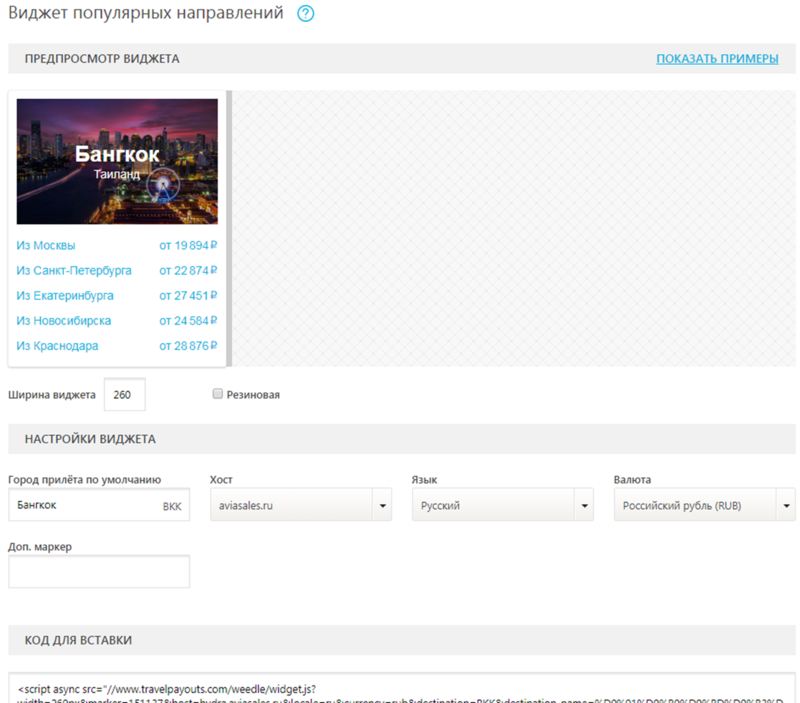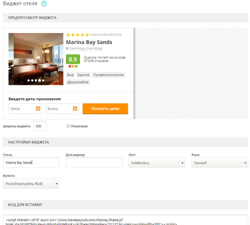 В настройках вы указываете ширину виджета, отель, валюту, язык и маркер (для удобства ведения статистики трафика).
