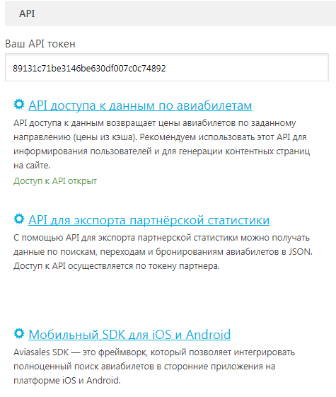 Сервис предоставляет API для доступа к данным по авиабилетам, экспорта партнерской статистики в JSON, и для интеграции поиск авиабилетов в сторонние приложения на платформе iOS и Android.
