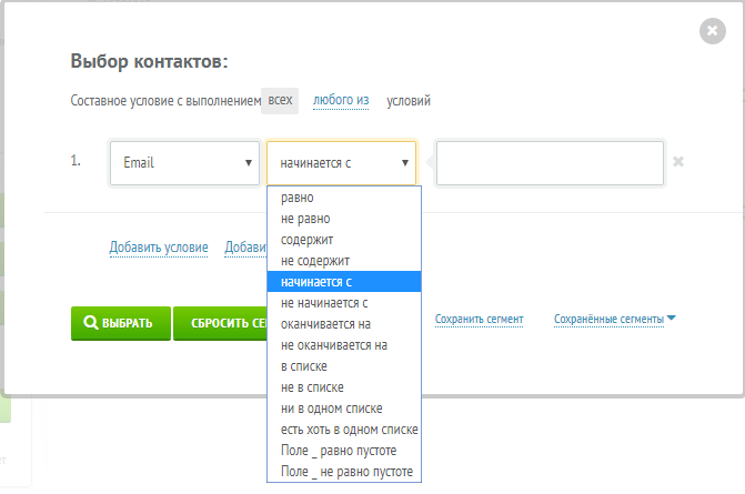 Чтобы отобрать нужные контакты, необходимо будет перейти по ссылке “Управление списками”, которая находится в левом столбце меню личного кабинета. И здесь нужно будет выбрать параметр сегментации.