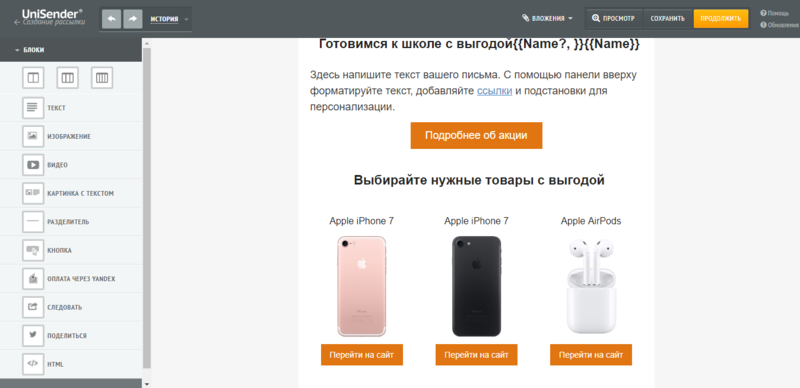 Как все будет заполнено нажимаем продолжить и в новом окне создаем само письмо. Можно воспользоваться блочным редактором, выбрать готовый шаблон или просто набрать текст сообщения.