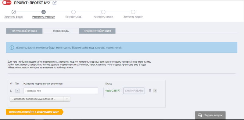 После проверки кода, откроется страница настройка связи. Здесь нужно будет редактировать подменяемые элементы. Слева будут находиться ваши ключевые слова из объявлений. На другой стороне будут варианты замены, которые будут выводиться вместо стандартных, если посетитель зайдёт поэтому объявлению. Вам будет необходимо прописать все заголовки и подзаголовки по всем рекламным объявлениям.