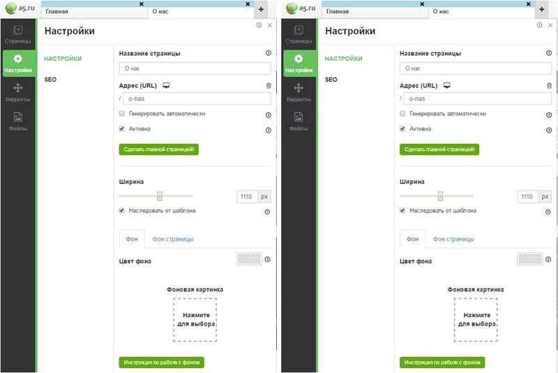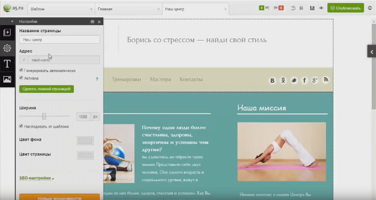 - «Настройки». В настройках страницы определяется название страницы, задается URL, включается/отключается его видимость в поисковых системах, также можно сделать страницу главной. Ну и стандартно, можно менять фон (это может быть просто какой-либо цвет или же фоновая картинка), менее стандартная возможность – изменение ширины страницы.