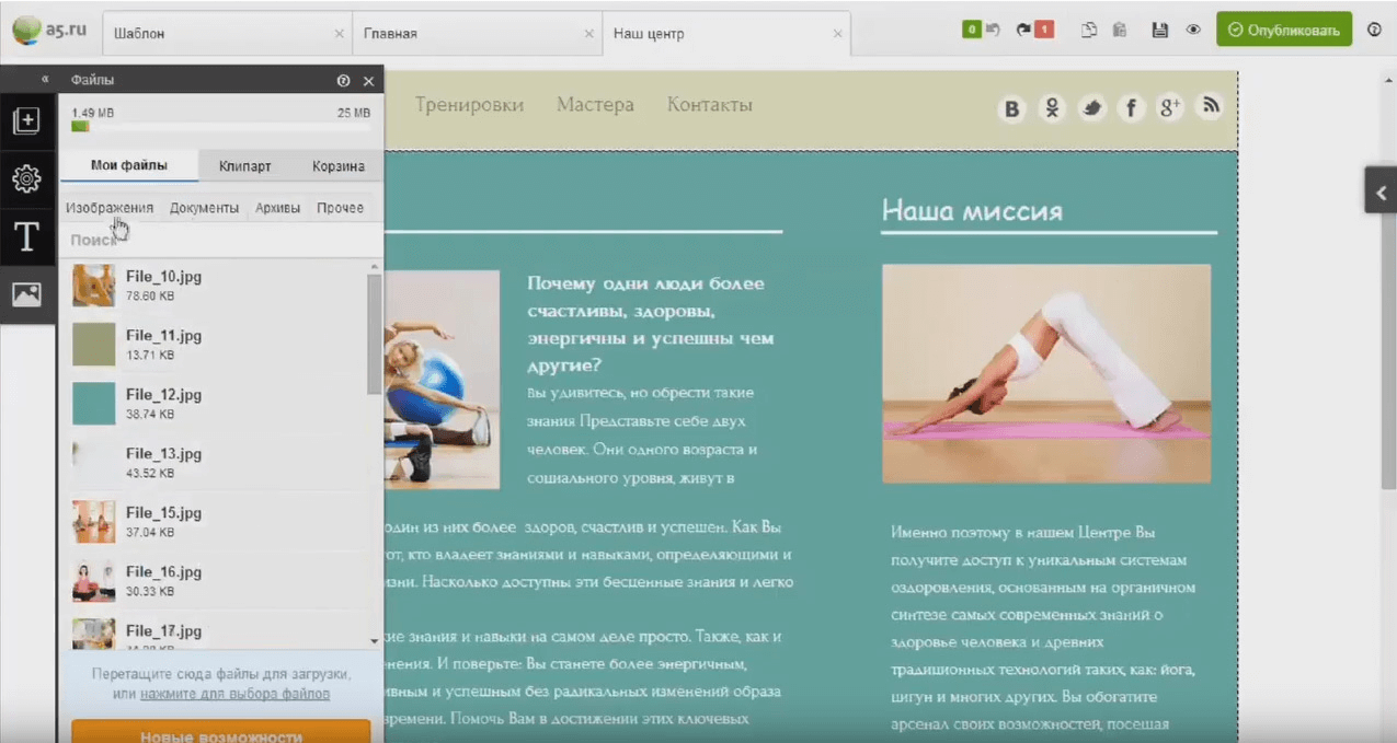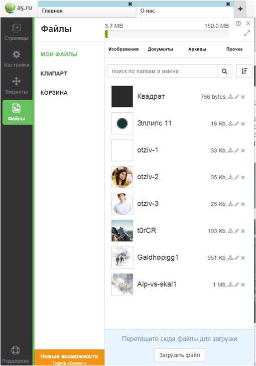 - «Файлы». Здесь хранятся все картинки из демо-версии шаблона, клипарты и загруженные вами файлы.