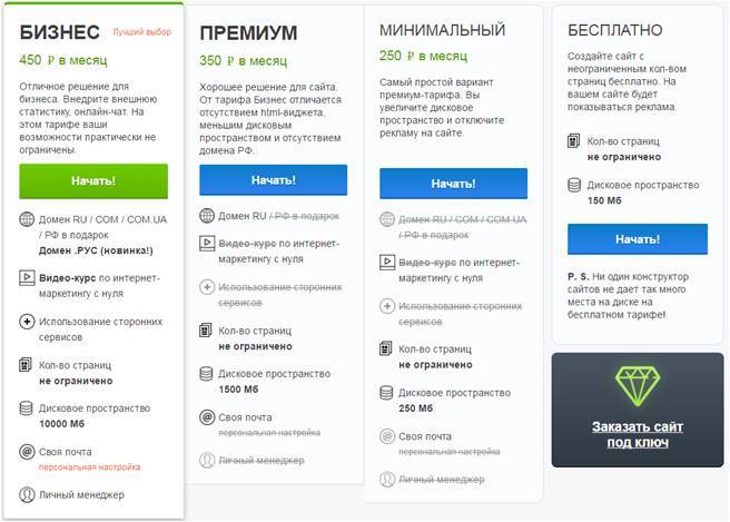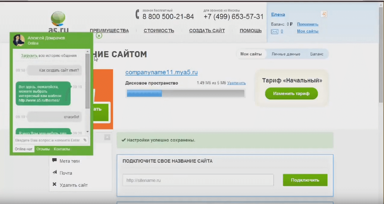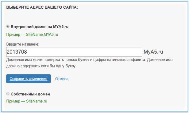 Домен. После регистрации вам выдается поддомен вида 2013667.mya5.ru. После поддомен можно изменить. Переключиться на собственный домен, можно только после подключения одного из платных тарифов. Чем круче тариф, тем больше доменов можно подключить. Делается это в личном кабинете, в разделе «Мои сайты».