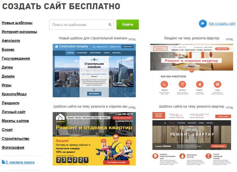 Всего сервис предлагает более 300 шаблонов, которые разбиты по категориям. Сразу отметим, что шаблоны не адаптивны.