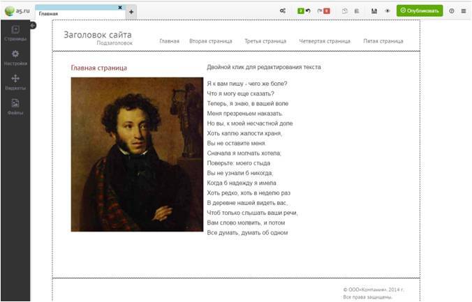 Если вас не устроил ни один из шаблонов или же вы точно знаете, чего хотите и как этого можно добиться, есть возможность создать сайт «С чистого листа». Не сказать, что лист совсем чист, там имеется хедер и футер, и в качестве напутствия вас будут ждать фотография Пушкина и фрагмент письма Татьяны к Онегину.