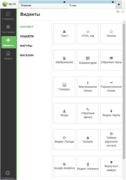 - «Виджеты». Здесь находятся все функциональные элементы, которые, для удобства поиска, разделены по категориям. И надо заметить их довольно много: обратный звонок, вернуться наверх, HTML-код, калькулятор, галерея, социальные кнопки, Facebook/Twitter/Google+/ОК like, каталог товаров и прочее.